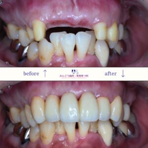 | 治療内容 | 主訴:前歯がぐらぐらする 上顎前歯部で重度の歯周病がみられ、激しい動揺がありました。唇側にフレアアウトしており、このまま放置すると自然脱落のリスクが高い状態でした。 単純に歯を残すのではなく、「機能・見た目・長期安定」を満たす治療を重視しました。 そのため ・保存不可能な歯の抜歯 ・歯周基本治療(炎症のコントロール) ・補綴治療による審美・機能回復 を段階的に行いました。 治療後 ・前歯の動揺は消失 ・噛める機能を回復 ・自然で違和感のない見た目 患者様からは「人前で笑えるようになった」とのお声をいただきました。 |