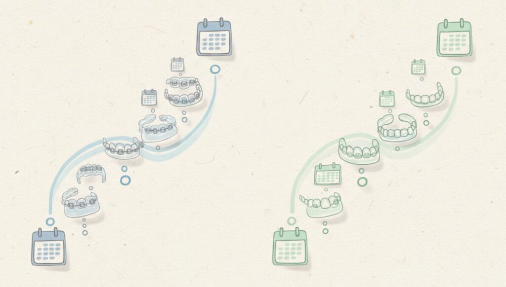 ワイヤー矯正とマウスピース矯正、どちらが早く終わるのか・・・この疑問は、矯正相談に来られる患者様から最もよくいただく質問の一つです。「できるだけ早く歯並びを治したい」「結婚式までに間に合わせたい」「転勤前に治療を終えたい」など、それぞれの事情があります。