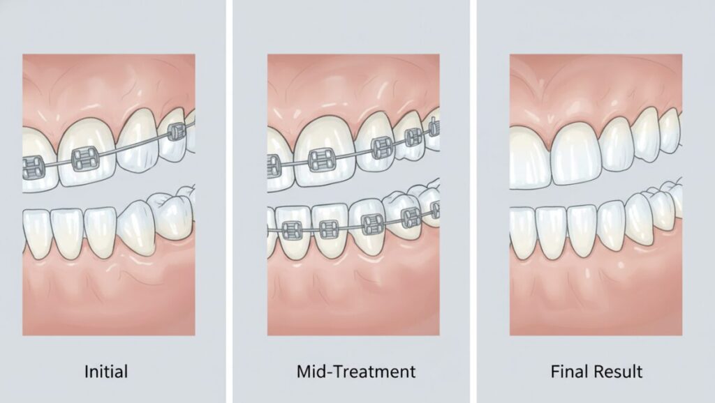 重度の開咬では、ワイヤー矯正で「2年半~3年以上」が目安です。マウスピース矯正では対応が難しい場合が多く、ワイヤー矯正が第一選択となります。
