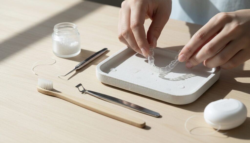 毎食後の歯磨き、フロスや歯間ブラシの使用、マウスピースの定期的な洗浄を習慣化しましょう。